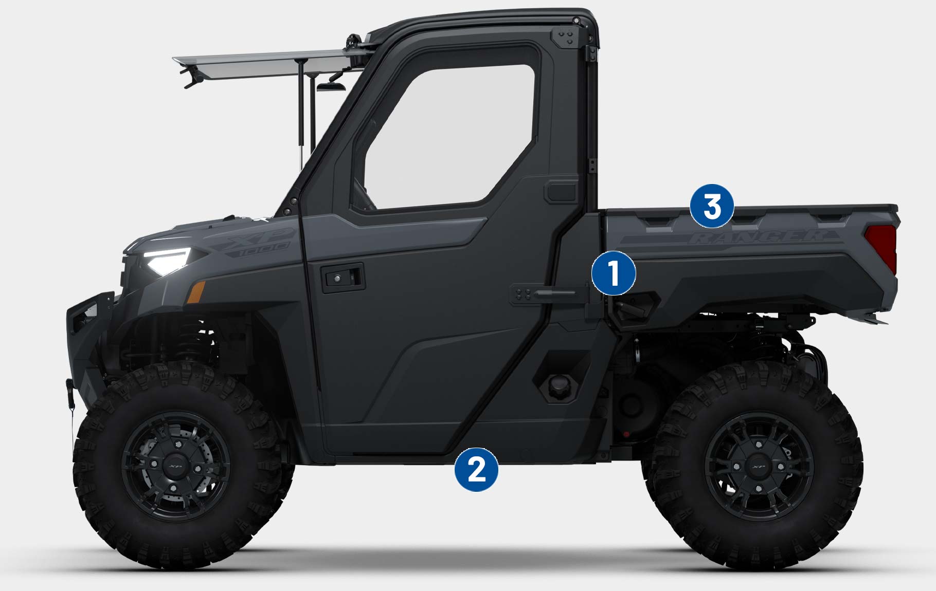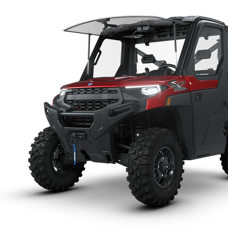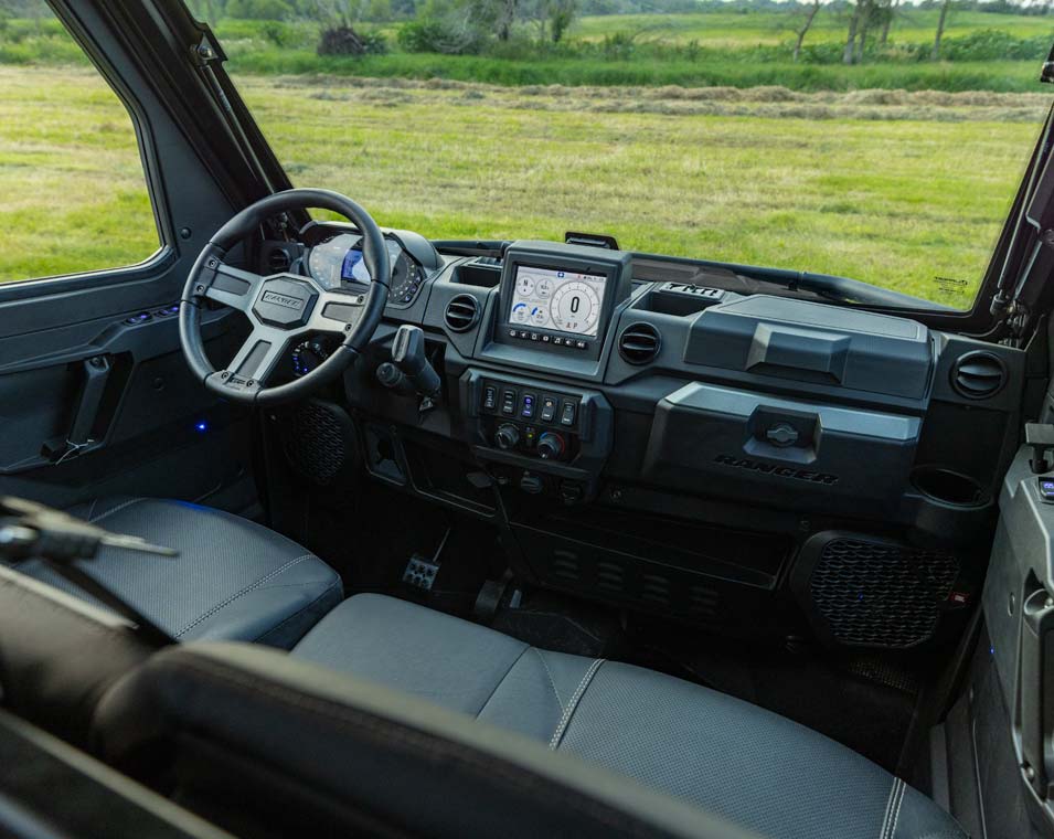 Premium Pro-Shield Cab w/ Roof; Doors with Crank Windows; Full Glass Tip-out Windshield with Wiper; Rear Glass Panel; Factory-Installed Heat, AC, Defrost; Rearview Mirror; Premium Steering Wheel and Interior Accents; NorthStar Tailgate Badge; Front Bumper with Integrated Winch, Plow & LED Mounts; Premium Cut & Sew Seats with Contoured Seatbacks and Embroidered Polaris Branding; 2,040 kg Winch with synthetic rope, Auto Stop and wireless remote; Polaris Pulse Electrical System (6-Position) Underhood Busbar and 6-Position Roof Busbar; 12V Accessory Outlet; Battery Trickle-Charging Outlet; USB Outlet, Factory-installed cab system with powered doors, roof, glass tip-out windshield, glass rear panel, rearview mirror, windshield wiper/washer, and sound insulation materials.